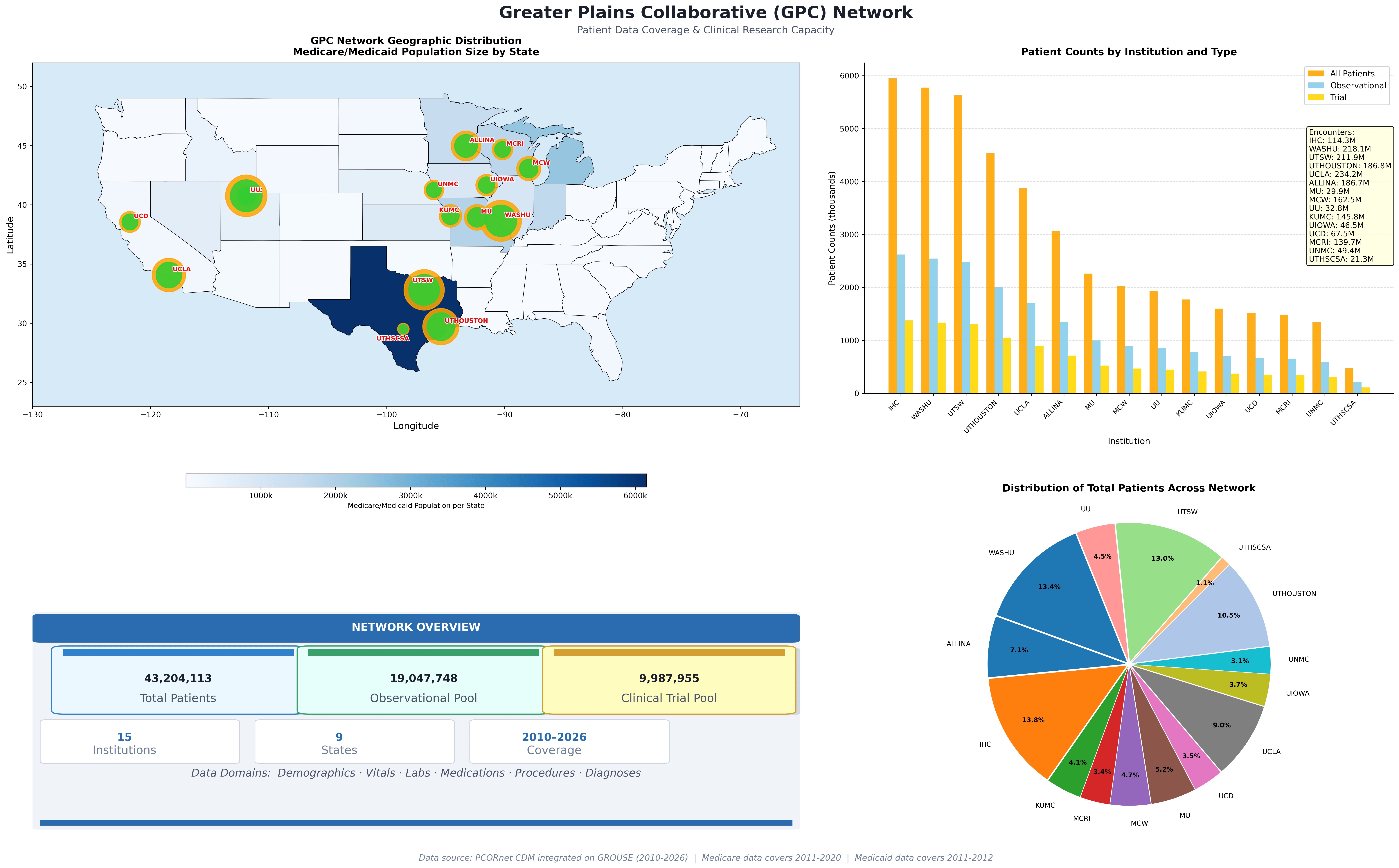 GPC is a network with a shared vision of improving healthcare delivery through ongoing learning, adoption of evidence-based practices and active research. Our GPC network brings together a diverse population of over 43 Million patients across 1,550 miles covering 9 states with a combined area of 783,907 square miles. The GPC supports a variety of collaboration opportunities for investigators and researchers ranging from feasibility counts and de-identified data to grant support and patient recruitment for trials.